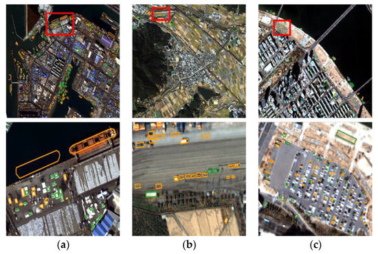 Figure 4 shows the images used for the experiments. The areas selected for study from each dataset had many changed and unchanged small objects, such as buses, trucks, ships, and containers. Study areas are marked with red boxes in Figure 4. From the Incheon images, one coastal area was selected. From the Chilgok images, one rural area was selected. From the Seoul images, one downtown area along the Han River was selected. The previous and recent images of each study area are shown in Figure 5.