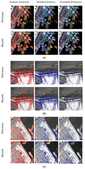 Figure 7 shows the results from feature extraction and matching with the three test datasets. Within each dataset, feature extraction results (left images), matched features (middle images), and unmatched features (right images) are shown in both previous and recent images. Figure 7 also shows the changed reference objects in orange polygons and the unchanged reference objects in green polygons. We can visually check that features within unchanged objects matched, and that features from changed objects did not match.