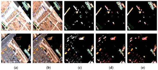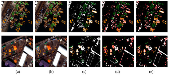 Comparison of pixel-based and feature point-based change detection results for Incheon: (a) before images, (b) after images, (c) pixel-based results, and feature-based results using (d) SIFT, and (e) AKAZE.
