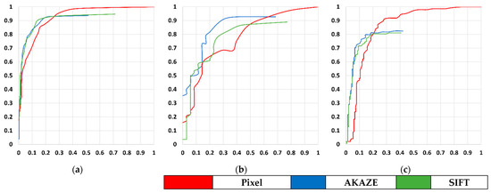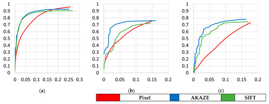 The ROC curves for pixel-based and feature point-based change in (a) Incheon, (b) Chilgok, and (c) Seoul. X-axis represents false alarm rate and Y-axis recall.