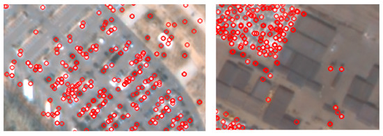 Feature points used in this paper are the points that have distinctive texture patterns, such as abrupt brightness changes in their vicinity. Feature points are regarded as a means to describe an arbitrary object, and they have been used to find corresponding points of the same object through matching [37,38,39]. In this paper, we wish to check whether they can be a useful unit of change for small objects. We used Scale-Invariant Feature Transform (SIFT) [35] and the Accelerated-KAZE (AKAZE) algorithm for extracting feature points [36]. SIFT can extract features robust to image rotation, affine transformation, and scale [46]. It constructs a scale space using a Gaussian kernel, generates a Difference of Gaussian (DoG), and localizes feature points by eliminating low-contrast points. AKAZE uses a nonlinear diffusion filter to remove noise and highlight edge areas and detect feature points as points with the maximum response of a Hessian-based filter [36]. The brightness values of ortho-rectified panchromatic bands were re-scaled from 16 bits to 8 bits, and feature extractors were applied. Through this processing, a lot of features were generated from previous and recent images. In many cases, multiple features at very close distances were extracted from a single object. For some very small objects, no features were extracted. However, to check the capability of feature-based change detection, we did not apply additional post-processing to filter out these multiple features or to amend objects without features.