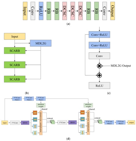 Flowchart of the proposed direction constrained stripe adaptive extraction subnetwork. The arrow box denotes the feature map extracted by image spatial recurrent neural network (IRNN). (a) Direction constrained stripe adaptive extraction subnetwork. (b) Direction constraint spatial context module (DCSC). (c) Spatial context aggregation residual block (SCARB). (d) Multi-direction awarded local to global module (MDL2G).
