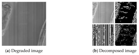 It should be noted that the input data of the wavelet-based direction-constrained stripe adaptive extraction subnetwork are no longer the original image data, but wavelet sub-bands (coefficients) [] after DWT. Image data can be explicitly decomposed from the spatial domain transform to the frequency domain into different frequency information through wavelet transformation. This removes the complexity in the calculation and information loss. Here, we utilize the Haar wavelet transform as the mapping method between the image data and frequency domain. Let I denote the input image data, the Haar wavelet transform which decomposes I into four sub-band images through four bandpass filters: approximation of image (LL), horizontal detail (LH), vertical detail (HL), and diagonal detail (HH) bands []. Given the orthogonality of the DWT filter, the image can be reconstructed by the inverse wavelet transform (IWT). As stripe patterns usually emerge with certain directional characteristics, they exhibit certain performance in fixed coefficients after DWT operation. As shown in Figure 4, stripe patterns show notable performance in vertical coefficients, but insignificant in the horizontal and diagonal coefficients. Owing to this, we combine DWT with CNN to provide prior information for the extraction subnetwork and to ultimately improve the efficiency of extracting stripe patterns.