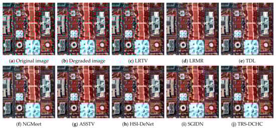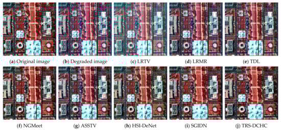 The Hyperion EO-1 data have considerable stripe noise, random noise, and dead lines. The size of our experimental data was 200 × 200 × 210. The LRTV method still yields a considerably large area of residual noise, as shown in Figure 13b. LRMR and TDL have a certain significant effect on random noise, but the removal effect on stripe noise and dead lines is unsatisfactory, as indicated by Figure 13c,d. NGMeet can remove large-scale interference factors to a large extent, with only a small amount of unremoved noise, as shown in Figure 13e. Figure 13f illustrates that the ASSTV method has a good suppression effect on stripe noise and dead lines, but its ability to remove random noise is limited. As clearly indicated by Figure 13g, HSI-DeNet can remove nearly all noise, but it inevitably triggers smoothness-related problems. Similarly, SGIDN suffers from a severe over-smoothing problem, and the repair of the dead line interference area is incomplete, as shown in Figure 13h. Figure 13i illustrates the TRS-DHC good performance, where stripe noise, random noise, and dead lines are removed.