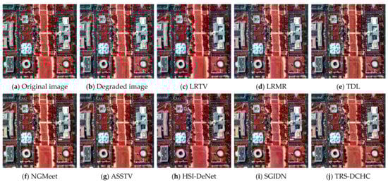 The evaluation results are shown in Table 2. We also show the destriping results without incorporated real data (denoted as DCHC) and incorporated real data but without wavelet (denoted as TRS-DCHC-noW). The best results are indicated in bold. The simulated destriping results are displayed in Figure 6, Figure 7 and Figure 8 with pseudo color images (bands: 57, 27, and 17). In Case 1, LRTV has a good processing effect (see Figure 6). Moreover, Figure 6e,f) shows that LRMR, TDL, and NGMeet are not very effective in processing periodic stripe noise, and there are still large areas of stripe residue. In particular, NGMeet also introduces the problem of spectral loss. The stripe removal ability of ASSTV was better than that of the previously mentioned methods. It exhibits some suppression impact on stripes, but the impact is limited. Figure 6g shows considerable stripe noise that has not been completely removed. Considering the CNN-based methods, HSI-DeNet and SGIDN have prominent processing effects on stripes, which can remove nearly all stripes, but the consistency of the spectral information of the destriped image is poor; especially for HSI-DeNet where there is loss of detail (see Figure 6h for details). TRS-DCHC stands out with promising advantages in stripe removal, as it can remove all stripes and can achieve satisfactory results in the recovery of the destriped image, which is basically the same as the original image.