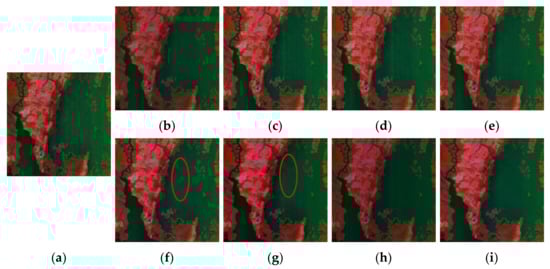 For scene 1 with 512 × 512 × 180 size, the original image contained many stripes, and the noise level is strong. The experimental results show that although LRTV can suppress a portion of the stripe noise (see Figure 9b), the structure and texture of the stripe-free component of the image itself are destroyed. LRMR and TDL are not effective with stripe removal, as can be seen in Figure 9c,d. After the NGMeet processing, most of the stripe noise is removed over land, but the residuals of strip noise are evident over the water body. A small fraction of strips is not completely removed, and the spectral information of the destriped image also differs from that of the original image, as illustrated in Figure 9e. Further, Figure 9f shows that the ASSTV method has a good inhibitory effect on the stripe; the striped result has prominent noise residue. Although the HSI-DeNet can effectively alleviate the stripe noise, the spectral information of the restored image is modified. Moreover, the over-smoothing phenomenon emerges as shown in Figure 9g. After the SGIDN processing, the stripe was more effectively suppressed, but some spectral information was lost as indicated in Figure 9h. Figure 9i illustrates that the TRS-DCHC method achieved a satisfactory result, while the spectral information of the destriped image and the details and texture of the ground object remain intact.