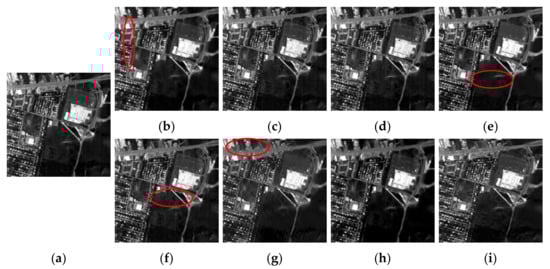We selected two scenes of GF-5 data for the real data experiment corrupted by mixed stripe and random noises. The destriped results are presented in Figure 9 and Figure 10. Some unobvious stripe residues or spectral loss areas are marked by the red eclipse.