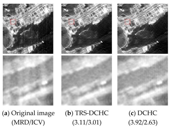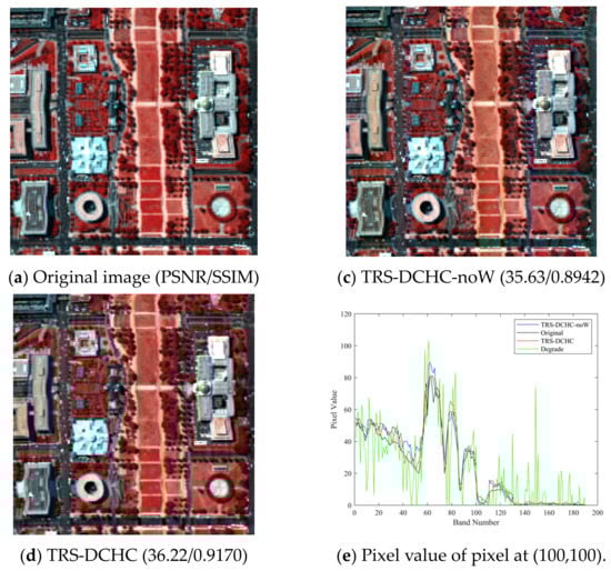 From the index evaluate results, as reported in Table 2, the DCHC and TRS-DCHC -noW can also provide a better destriping performance. However, the overall index of TRS-DCHC was the best, the performance was relatively stable, the processing of various stripes was with facility, and the repair performance was also ideal. Both visual comparison and quantitative comparison proved the superiority and the efficiency of TRS-DCHC compared to previous approaches.