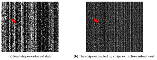 As the data with real stripes do not contain corresponding ground truth data, they are unsupervised in the real stripe sample extraction process. Hence, the model cannot be trained by calculating the loss between the network output and ground truth as supervised learning. Rudin et al. [] has demonstrated that the total variation (TV) of noise-contained images is larger than that of clean images. Owing to this, we used TV loss as the loss function of the extraction subnetwork during the training process. As the extraction subnetwork is aimed to generate stripe patterns from real stripe-contained data, which are more complex and random than simulated stripes, it does not concentrate on the consistency between the extracted stripe and the stripe on the real image. Therefore, it can be constrained by TV loss, which is calculated by