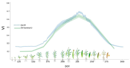 EVI temporal series for the 2017 maize growing season for SW fields using Sentinel-2 (solid green line) and PF (dash blue line). The shaded area around both lines represent the standard deviation of the EVI values for the fields under study (pink dots Figure 1(a.2)). Maize phenology progress and development stages is depicted on the x-axis.