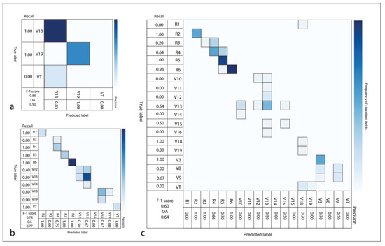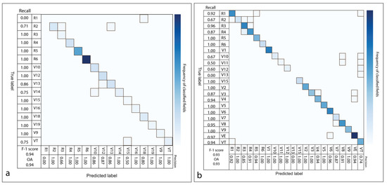 When evaluating the performance of RF, the most commonly used metrics are overall accuracy, precision, recall, and F1-score [62]. Considering the examples in the literature we can obtain these metrics following the Equations (1)–(4) [63]. Most of the literature studying the performance of these metrics is centered on balanced binary classifications. In this paper, the ground-truth data set presents more than 18 classes, where each class does not contain the same number of samples. According to [64], F1-score, defined as the harmonic mean of precision and recall, can be a useful metric to use with respect to unbalanced data sets. In contrast, the use of overall accuracy, the total of correctly identified elements divided by total number of elements to be classified, can be misleading since it will favor the most represented class [65]. Precision represents the fraction of samples assigned to the class that are in fact part of the class, and recall represents how well the class was predicted.
