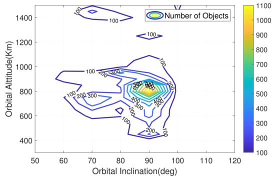 In this paper, the NORAD catalog is selected as the reference. The initial task is to select a good number of objects cataloged as reference examples to demonstrate distribution. The TLE-formatted low Earth orbiting (LEO) objects and objects in the GEO region during the period 1–7 July 2020 are used in this study. All TLEs are obtained from www.space-track.org (accessed on 10 January 2022). (Note that the space-track website does not provide the RCS of the cataloged objects in Basic Services. They will provide the cataloged objects RCS on in Advanced Services. The Advanced services are available to all entities who sign an SSA Sharing Agreement with USSPACECOM.) Figure 1 and Figure 2 shows the orbital altitude–inclination distribution of low Earth orbiting (LEO) objects and the Earth fixed longitude–latitude distribution of objects in the GEO region.