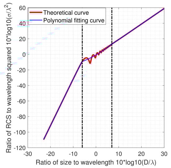 where is the second-order norm of a vector. In fact, the coefficients can be estimated by the least-squares method with the theoretical RCS, D, and as inputs. According to the relation between the RCS and wavelength, the scattering zone is usually divided into the optical zone and the Rayleigh zone , with the resonance zone in between, in which the RCS in the resonant zone fluctuates strongly with the object diameter and wavelength. There is no strict criterion to specify the RCS zones. As in [31], the diameter-to-wavelength ratios of 0.25 and 5.0 are used in this paper to form three RCS zones, and this results in a curve of the theoretical RCS as a function of the diameter-to-wavelength ratio, shown as red in Figure 3. It is seen that the RCS fluctuates in the resonance zone; thus, the mapping between the RCS and the diameter-to-wavelength ratio is not monotonic anymore, so the polynomial fitting of the theoretical RCS should be made separately for different zones. For the curve in Figure 3, it needs three polynomials, respectively, for three zones. For the optical or Rayleigh zone, a third-order polynomial will approximate the red curve in the specified zone. For the curve in the resonance zone, a second-order polynomial would be appropriate. Assuming the radar frequency f = 438.5 MHz, the polynomial fitting results are as follows, which are shown as blue in Figure 3: