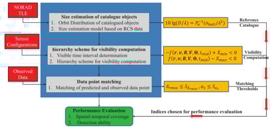 In this paper, we focus on the two important features regarding the detection performance of a sensor: one is the spatial-temporal coverage of the sensor and the other is its actual object detection ability. Given appropriate definitions of these two features and the corresponding indices, which can be computed, the detection performance can now be evaluated with the procedure shown in Figure 6. We propose using detection probability, which is defined as the ratio of the number of both observed and matched arcs to the number of predicted arcs, to measure performance. The inputs include the TLE catalog, the sensor parameters, and the observed data. The thresholds for the data match also need to be set.