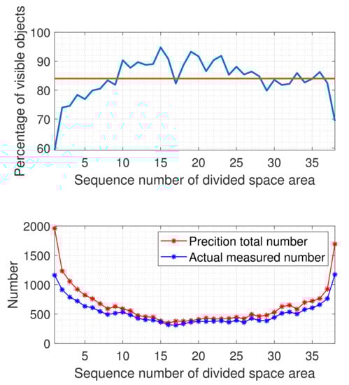 The space coverage in this paper is concerned with the detection probability in the intended space area. If the space area covered by the sensor is large, the space can be further divided into multiple regions of equal area. Figure 7 and Figure 8 shows the simulated radar’s detection performance over a time span of 24 h in the covered space. In the Figure 7, the visible objects, marked as blue circles, are the observed objects, and the invisible objects marked as red triangle are the predicted, but not observed objects. They are shown with respect to the distance between the radar and object, and the space angle, which is the zenith angle of the object. In order to differentiate the location of an object, the space angle is set positive if the object is in the east part of the sky, and negative if it is in the west.