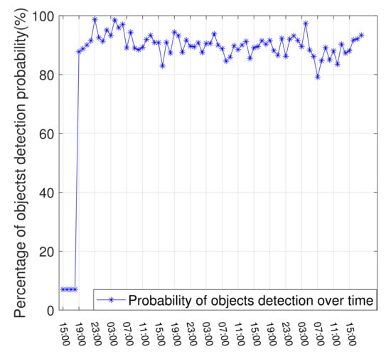 As can be seen from Figure 9, the overall detection probability of the radar over time is relatively stable at over 80%, with the peak at almost 100%. However, the performance appears to decline slowly with time even in the short span of 72 h, which could be a concern to be monitored further. A very disturbing issue is that the radar does not perform well in the early stage of the operation, during which the detection probability is very low. In most cases, slight fluctuations in the detection probability over time would be hard to notice without a detailed and continuous temporal stability evaluation against a reference catalog. It helps to obtain an accurate assessment of the sensor’s detection performance stability in each time interval, along with the long-term operation capability.