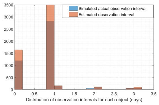 Another important performance index is observation timeliness, which describes the time interval between two consecutive observed orbit arcs for an object. A short interval indicates that more orbital arcs are observed, which is necessary for achieving high precision orbit determination of an object. By comparing the differences between the predicted intervals and the actual intervals, a sensor’s operation strategy can be optimized. Figure 10 shows the distribution of the time intervals for GEO objects observed by the simulated space-based optical telescope.