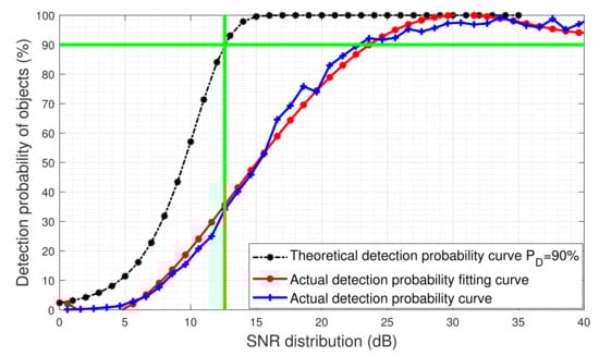 It can be seen from Figure 11 that when the SNR is higher than 12.6 dB, the theoretical detection probability will be above 90%. However, the actual detection probability will only reach 90% when the SNR is higher than 23 dB. This is most likely caused by the uncertainty in the estimated object’s RCS. By comparing the detection probability curve of objects with the Swerling model of RCS fluctuation [30], it can be found that the RCS fluctuation of detected space objects is similar to the RCS fluctuation model of Swerling Type I for slow objects; these objects are usually difficult to detect. Because the geometrical structure and attitude of space object are very likely unknown, the assumed object RCS will be different from the actual RCS; therefore, it is understandable that the actual SNR-dependent detection probability is different from the theoretical one. The difference can only be obtained by accurately evaluating the actual SNR-dependent detection probability for on-orbit objects.