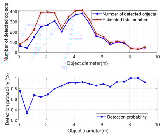 The size-related object detection probability is more intuitive for describing an optical sensor’s object detection ability. As presented earlier, object size is estimated from RCS, which itself has unknown uncertainty, and thus the resultant size has uncertainty. Consequentially, the size-related detection probability curve is less smooth. Considering the simulated space-based telescope, the size-related detection probability for GEO objects is shown as a function of object size in Figure 12.