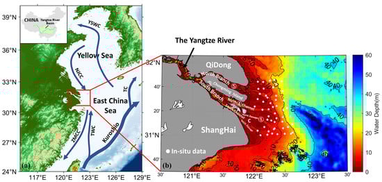 As the longest river in Asia, the Yangtze River is approximately 6300 km long and its annual runoff and sediment volume rank the fifth and fourth in the world, respectively [1]. The Yangtze River carries 3.84 × 108 tons of sediment to the sea every year (from 1950 to 2011) [2], bringing a huge amount of suspended sediment (SS) to the Yangtze River mouth. SS plays a crucial role in the ecology and topography development of the estuary. Nutrients carried by sediment can benefit fisheries by raising the primary productivity of the sea, but the high concentration of nutrients may cause red tides [3]. In the joint influence of dynamic factors such as tide and wave, SS in the Yangtze River mouth can cause seabed sediment to redeposit and reshape the landscape [4]. Sediment transport is also closely related to many kinds of estuarine engineering [5,6,7,8], including the construction of artificial islands, tunnel construction, and dredging projects—projects which also complicate the dynamics of sediment in estuaries [9]. Considering all these factors, it is of paramount significance to study the distribution and transport of SS in the Yangtze River mouth for environmental protection, construction evaluation, and later engineering instruction.