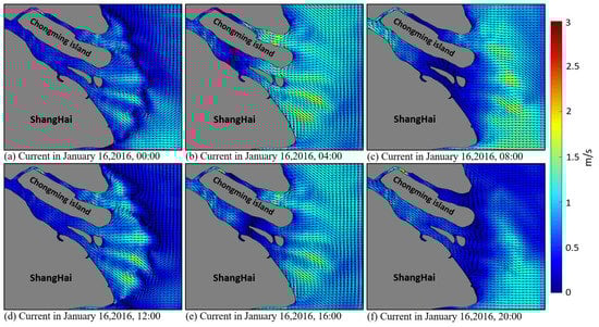 The Yangtze River mouth is a mesotidal estuary, with an irregular semidiurnal tide inside the mouth and regular semidiurnal tide outside the mouth [59]. Taking the current on 16 January 2016, as an example, the current direction and velocity change with time obviously (Figure 3). At the beginning of the flooding period, the current flows from the west of Hangzhou Bay to the east of the bay (Figure 3a), whereas at the beginning of ebbing period (Figure 3f), the currents flow in the opposite direction compared with the flooding period. Westward currents (Figure 3b) and eastward currents (Figure 3c) dominate the bay during the middle–late flooding period and middle–late ebbing period, respectively. The current velocity also changes with time with velocity in the range of 0.3–2 m/s (Figure 3).