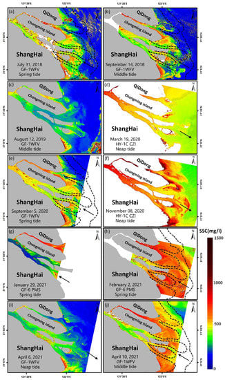 In total, forty images from different seasons and different tidal periods were analyzed and ten of them are shown in Figure 3 as examples. The SSC in Yangtze River mouth is generally high with the value in the range of 200–1300 mg/L, belonging to high turbidity water. The high SSC area is mainly distributed in the north branch and tidal flat area where the water is shallower, whereas SSC in the south branch is generally lower than in other areas, up to 700 mg/L. The seasonal difference in SSC is obvious: SSC in the winter is generally higher than in summer (Figure 4). During the initial stage of flooding (Figure 4g,h,j), SSC in the estuary is generally high except in the south branch, where the SSC is 100–400 mg/L lower than in other areas. During the end stage of flooding (Figure 4a,b,e), the SSC in the estuary become similar, at approximately 300–600 mg/L, and gradually decreases from west to east. During the ebb tide, the SSC in both channels is even, and gradually decreases from west to east (Figure 4d,f,i).