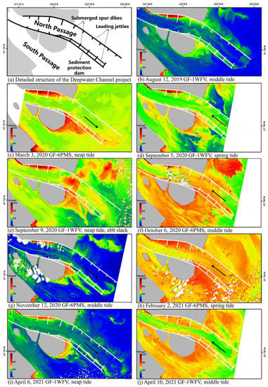 (a–h) SSC retrieved from the GF-6 PMS and GF-1 PMS images; (i,j) the underwater topography around the Chongqi Bridge and the underwater topography around the Shanghai Yangtze River Bridge.