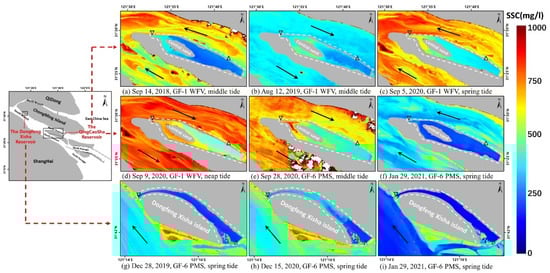 SSC distribution details in the Yangtze River mouth retrieved from GF-1 WFV, GF-6 PMS and HY-1C CZI images. Black arrows represent the current direction, and the black dotted lines represent the 5 m isobath and 10 m isobath.