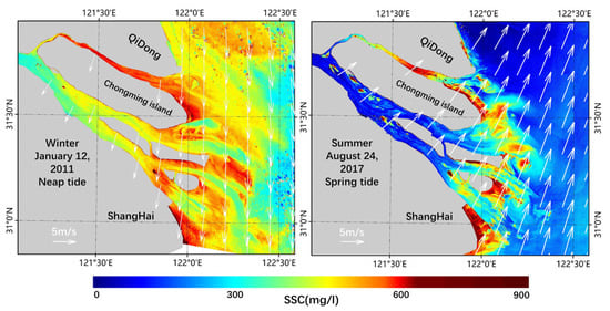 Generally speaking, the basic movement law of SS in an estuary is “supply by runoff, lift by wave and transport by current” [71]. In summer, the Yangtze River is in the flood season and the effect of the ocean is relatively weak, so the sediment resuspension in summer is weaker than it is in winter under the dominant effect of runoff. On the contrary, in winter, the runoff is weakened, the tidal current and waves are relatively enhanced and the resuspension of sediment is very strong under the support of wind and waves [72,73]. Due to the combined action of the above factors, the Yangtze River mouth’s SSC in winter is higher than that in summer [4].