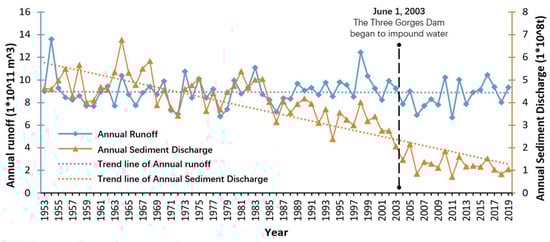 Annual runoff and annual sediment discharge recorded by Datong Station (the representative hydrological station) from 2000 to 2019. Data are from the Chinese River Sediment Bulletin, Ministry of Water Resources, PRC.