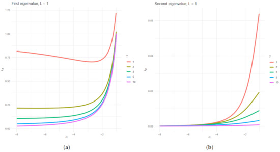 which are real numbers. Figure 1 shows the values of eingenvalues of the Fisher information matrix for several values of and parameters, and . Figure 1a,b show the first and second eigenvalues, respectively. It can be observed that the second eigenvalue tends to zero as for all values of and then, the matrix inversion becomes unstable for textureless areas, regardless of scale. Frery et al. [41] noticed that maximum likelihood estimates were unstable in some areas of the parameter space and analyzed this issue from the sample size viewpoint.
