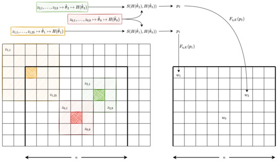 Figure 2 illustrates an instance of such implementation with . The left grid represents the image, while the right grid shows the mask that will be applied to the central pixel (identified in red cross-hatch).