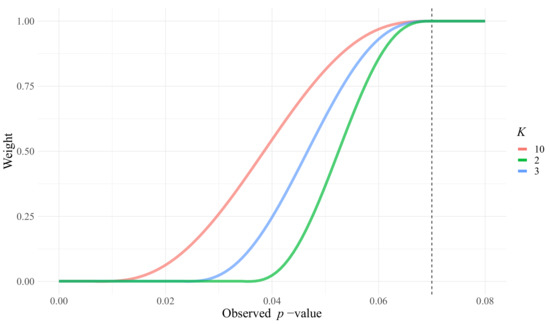 This function connects in a smooth manner the points and . We modify in order to connect and , for every , and define the weight w as a function of the observed p-value as the result of the following activating function: