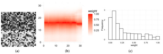 Original image patch, heat map, and histogram of weights over an edge, before normalization. (a) Original data. (b) Heat map. (c) Histogram of weights.