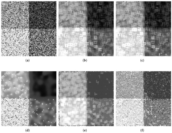 The ability of the filter based on the Shannon entropy to distinguish areas with the same mean but different roughness is noticeable in Figure 6. The edges between areas are also well preserved. For the sake of brevity, we omit the results produced by the filter based on the Rényi entropy, because they are similar.