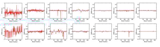 Spectral signatures’ curve of band 208 for the real Urban dataset estimated by different methods: (a) Original. (b) LRMR. (c) LRTV. (d) SSTV. (e) LRTDTV. (f) LRTDGS. (g) LRTDSSRTV.