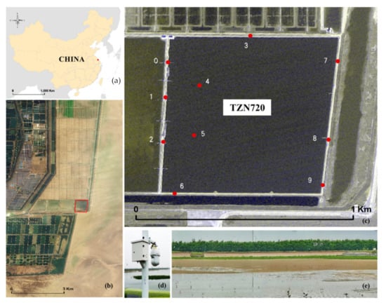 Overview of the Tiaozini wetland. The red point in (a) is a key staging site for migratory waterbirds, located in the east coast of Dongtai City, Jiangsu Province, China. The study site TZN720, the red square in (b), is a restored wetland and the monitoring site within the Tiaozini wetland; the red dots in (c) show the location of the 10 surveillance cameras; (d) shows the setup of a surveillance camera; and (e) is a panoramic view of TZN720 obtained from the cameras.