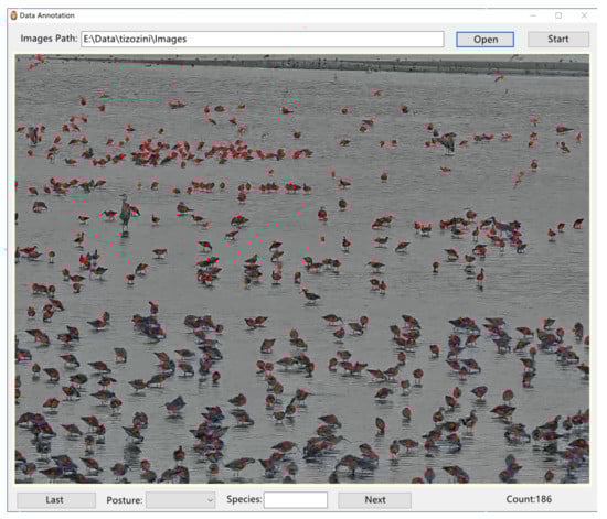 We developed an annotation tool for bird population counting. As shown in Figure 3, a point was placed at the center position of a target and the coordinates of the point were saved, representing a bird. Panoramic images are generally long. However, desktop computers have limited display size, and it is difficult to directly annotate panorama images using a desktop computer. Therefore, we preprocessed all samples in the data set to improve the labeling efficiency and reduce the labeling cost. The preprocessing procedure is divided into three steps.