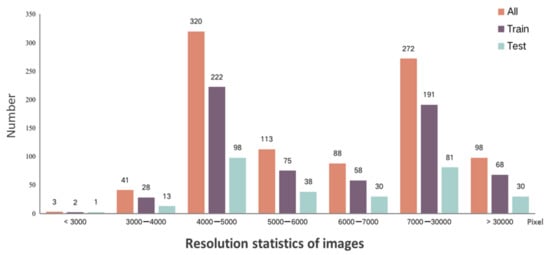 - Image resolution: Because the image features are not apparent, the image mosaic is incomplete, and some data are lost, so the images with a resolution lower than 4k in the dataset are removed.