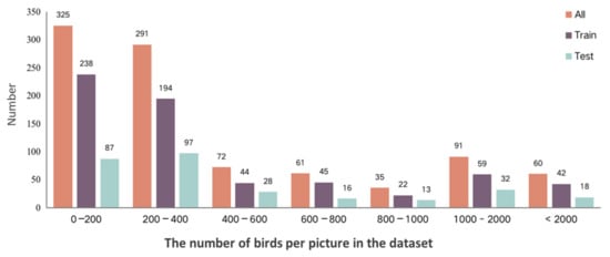 The whole dataset covers different camera scenes and has rich feature information. The dataset contains a total of 935 panoramic images of different sizes (Figure 5). It took 20 people three months to label and count the birds in these images. Manual counting revealed that there are 787,552 birds in this dataset. The number of birds captured by these images varied dramatically (mean = the average picture includes 842.30 and SD = 2089, Figure 6).
