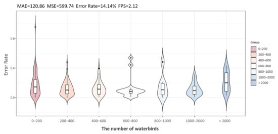 Distribution of absolute error rates in each group. The x-axis represents a grouping of panoramic images of different bird populations of magnitude. The number of birds contained in the panoramic image has different effects on the accuracy of the model.
