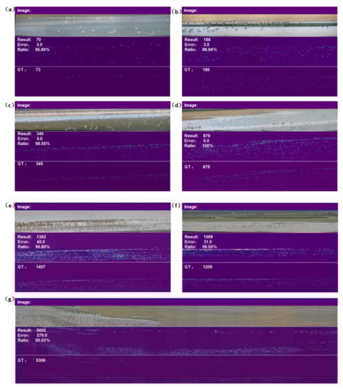 Examples of model output of density map and bird counting. We visualize the results of different orders of magnitude images to demonstrate the adaptability and practicability of our algorithm: (a–g) represent seven typical samples of different orders of magnitude, each consisting of the original image (top) and the resultant density map (middle) and total bird count in the image (bottom).