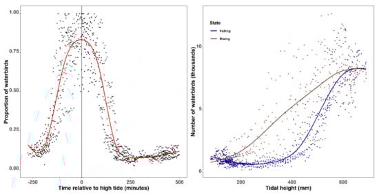 The relationship between the number of roosting waterbirds and tidal height is presented in Figure 8. The estimated number of roosting waterbirds traced the tide dynamics closely; as the tide rose, so did the number of roosting waterbirds (Figure 9a). However, the rate of change of the roosting waterbirds at falling tide was dramatically faster than at rising tide. The birds gathered slowly at rising tide, which suggested that the waterbirds foraging between tides were likely to linger in the intertidal zone for a longer period of time. When the tide receded and the mudflats were exposed, the birds tended to leave the roosting site quickly (Figure 9b). It is worth noting that it takes about 2.5 h to count 75 percent of the birds in this site during a field survey.