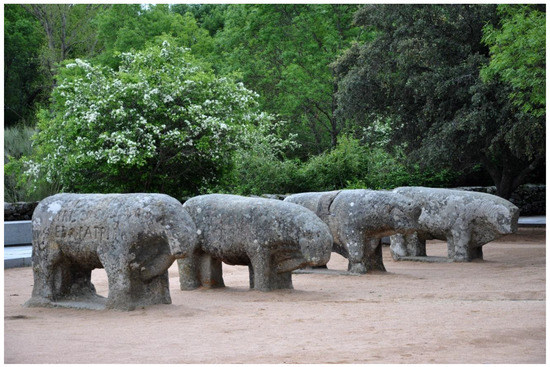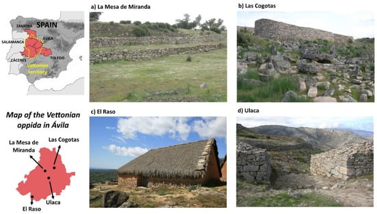The Vettones were one of the most prominent people in Celtic Hispania [42]. According to classical Greco–Latin authors, they occupied a wide territory of the Western Plateau corresponding to the current provinces of Ávila, Salamanca, and part of Toledo, Zamora, and Cáceres [43,44,45,46]. Throughout the Late Iron Age (ca. 400–50 BC) the first cities or oppida arose in this area of the western Peninsula. These nuclei controlled a wide territory to ensure the subsistence of their hundreds or thousands of inhabitants and they were usually built in strategic places that had considerable natural defenses. Even so, settlements were reinforced with imposing stone walls, ditches, and chevaux-de-frise (Figure 1) [47,48]. In the vicinity of the oppida there were extensive cemeteries in which urns were deposited with the ashes of the dead and grave goods [49]. Livestock was one of the fundamental pillars of the economy of these people, which explains the more than 400 granite sculptures representing bulls and pigs—popularly known as “verracos” (boars)—scattered throughout the Vettonia or region of the Vetton people (Figure 3) [50,51].
