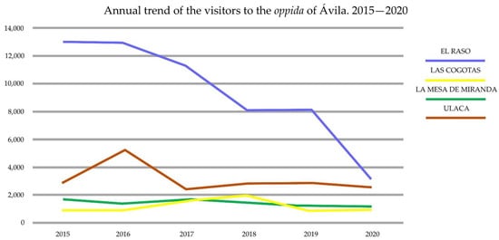 Articulating territories for tourism (such as the case of Ávila) requires complementarity among the tourist practices that visitors can carry out in them, in the so-called archaeotourism [33]. Certainly, this modality is not the main motivation for tourists and hikers to travel to the region, but in recent years (ignoring the unique situation of a pandemic), it has generated an increasing interest. Between 2015 and 2019, oppida available for public visits have received about 92,000 visitors, highlighting the oppidum of El Raso and Ulaca that concentrate more than 82% of the total visits (62.12% and 20.70% respectively). These values are approximate, since the guards who collect the influx of visitors do not work every day and there have occasionally been periods without guards (Table 1 and Figure 2).