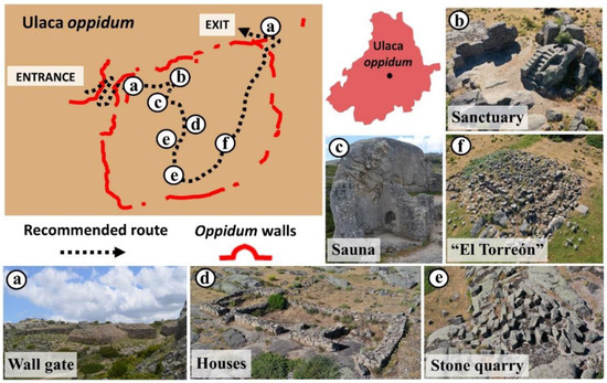 Once the visitor reaches the highest part of the hill, it is possible to contemplate a landscape dominated by granite rocky areas, among which a series of stone structures erected by the ancient inhabitants of Ulaca are scattered (Figure 4). Among them, the following stand out: (a) the gates built in its more than 3 km of walls [56]; (b) the sanctuary, with its famous rock altar oriented towards the highest peaks of the mountain range “Sierra de la Paramera” [57]; (c) a ritual sauna semi-excavated in the rock [58]; (d) a couple of excavated and restored houses [52]; (e) impressive granite quarries [59]; and (f) a ruined building of great proportions, known as “El Torreón” (the Tower) [60,61], built with large granite blocks that differentiate it from the more than 250 common constructions that can be seen scattered around different parts of the oppidum. In addition, the archaeological excavations carried out at the site in the last two decades have yielded the location on the northern slope of the hill of a necropolis and an area of artisan workshops, although these elements are not open to visitors for now [62,63,64].