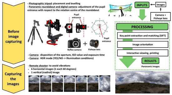 After a detailed study of the different possibilities of capturing panoramic images, it was decided to use a reflex camera and fisheye lens, based on seven images (at 60° intervals and an overhead shot). The main advantage of using these devices instead of 360° cameras (which automatically generate a panoramic image), is the higher quality and control of parameters (ISO, exposure, white balance, etc.). In this work, a Nikon D5600 model reflex camera with a 10.5mm 1: 2.8G fisheye Nikkor lens, capable of capturing images with a resolution of 24 MPx, was used. On top of the above, a photographic tripod and a Manfrotto 303SPH panoramic head was required, to obtain precise photographs in angular positions every 60° (Figure 6). Before taking the photographs, it is necessary to calibrate the camera (together with the objective) on the anterior patella, in order to align the entrance pupil with the axis of rotation of the panoramic patella and thus eliminate parallax. It is also necessary to configure the internal parameters of the camera, such as the aperture of the diaphragm, the exposure time, or the ISO value of the sensor, together with the activation or not of the HDR mode (Figure 6). Once this is done, photographs can be taken adopting the shooting protocol already explained and shown in Figure 6. In this way, the previous photographs are processed in the Hugin open-source software (http://hugin.sourceforge.net/, accessed on 27 December 2021), and, according to the workflow shown in Figure 6, the panoramic photo is generated. The process starts with the key-point extraction and matching among individual images. The extraction of key-points was performed by using the well-known algorithm SIFT (Scale-invariant feature transform). Then, the matching was carried out by using an L2-norm and the RANSAC (Random Sample Consensus) algorithm as suggested by Brown and Lowe [65], allowing us to compute the homography matrix between consecutive cameras. After that, a global registration phase was carried out with the aim of minimizing the error accumulation. During this stage the distortion parameters of the camera, its focal length and angular positions were optimized. Finally, the panorama was generated by projecting the images on the spherical coordinate system. During this stage a gain compensation and multi-band blending were used in order to fuse all the images property from the radiometric point of view [65]. As a result, a total of nine panoramas were created. Each one of them was stored in .jpg format with a low compression ratio to avoid the presence of artifacts.