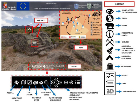 The sources of information previously identified, as well as the 3D point clouds and panoramic images, were integrated in a unique virtual environment. This virtual environment uses the panoramic images as the main support to which is attached the different information sources. This environment was developed by using the low-cost software Pano2VR® (https://ggnome.com/pano2vr/, accessed on 27 December 2021). Within this software the virtual platform was programmed by considering different web-based languages, such as HTML (markup language), CSS (design language), and JavaScript (programming language). The HTML and CSS languages were used for designing the content of the platform as well as its graphical user interface (GUI) (Figure 8). This GUI was made up by a HTML header and body. The header is de-voted to show information related with the entities involved. Meanwhile, the body is used for projecting the panoramas, the information, the map of the site, and a navigation menu. The information of the platform is shown by means of hotspots which are HTML entities that include a JavaScript function that allow an image file to be shown when the user clicks on it. The navigation menu includes several JavaScript functions that allow the point of view to be changed by rotating the panorama. Additionally, this menu includes zoom functions, an icon for open/close the map as well as several icons for opening PDF files with general information such as a historical guide or a geological guide. These PDF files are rendered by using an iframe entity (HTML language).
