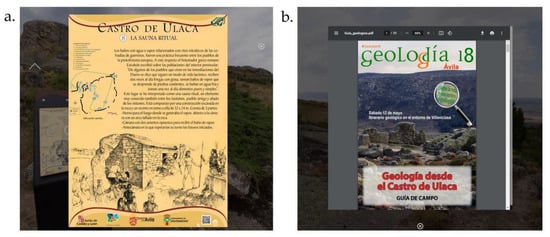 In total, the following were generated: (i) five cards (in .png format) explaining and showing the action of humans still present in the landscape of Ulaca, such as: the pivot hole carved into the rock in which the wooden door would fit to close the northern access to the oppidum; the wagon wheel tracks visible in the rock; several remains of pottery; wedge-holes in the stone quarries for the extraction of blocks for the construction of the monuments; or one of the bull sculptures found in the surroundings of the oppidum; (ii) 17 cards (in .png format) where the flora and fauna that can be found in the site are described (4 fauna cards and 13 flora cards). It should be noted that the current inhabitants of the area continue to dedicate themselves to raising livestock, so it is very common today to find cows and horses grazing within the archaeological site; (iii) five sheets (in .png format) explaining and showing: the different characteristics of the granitic landscape (such as erosion and weathering of the rock, the existence of joints and fracture zones or the for-mation of rock basins); the presence of springs in the area; or information on the formation of the Amblés Valley; (iv) 14 images of the different explanatory panels of the oppidum; and (v) seven documents (in .pdf format) and images (in .png format) showing and explaining the uses and function of the main monuments of the Ulaca oppidum (Figure 4).