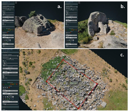 Different point clouds of the monuments of Ulaca oppidum: (a). Altar; (b). Sauna; (c). “El Torreón”, in which it is possible to observe the way of measuring and calculating volumes.